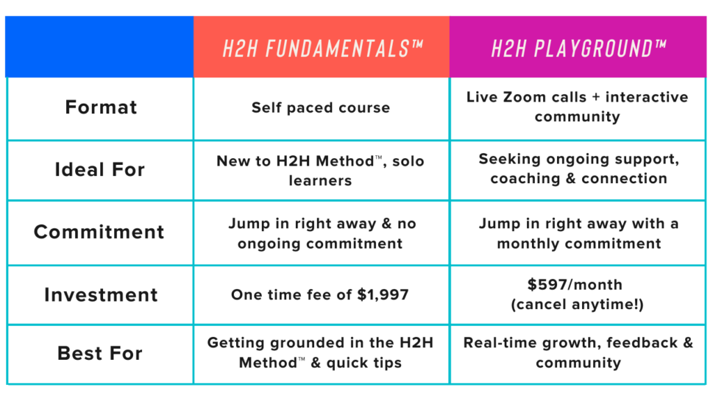 Practice your trial skills and master the transformative H2H Method™ with Sari and her faculty of certified coaches.